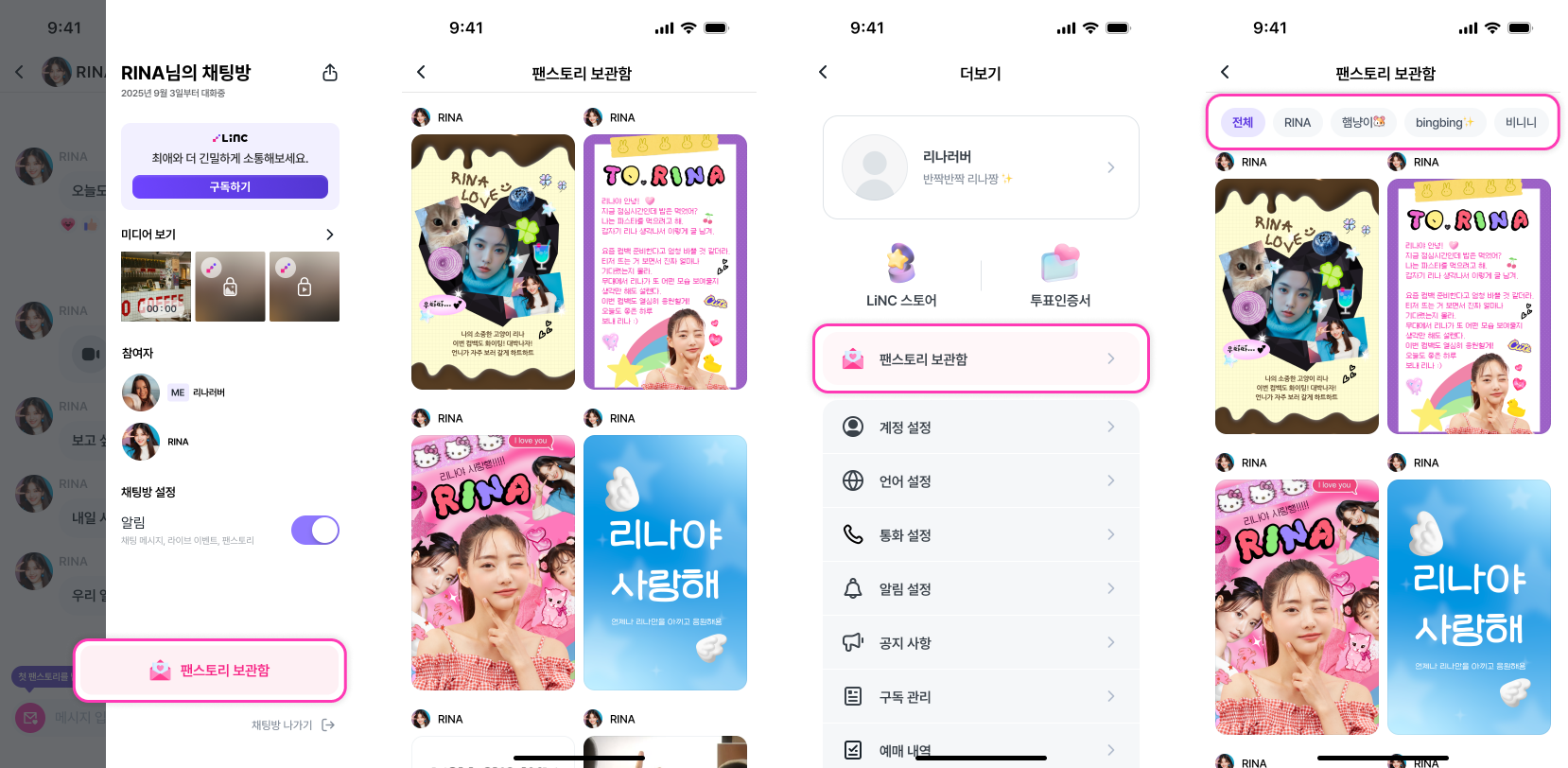 - 프라이빗 채팅방 메뉴(☰) → [팬스토리 보관함]: 해당 아티스트에게 보낸 Fan Story만 확인